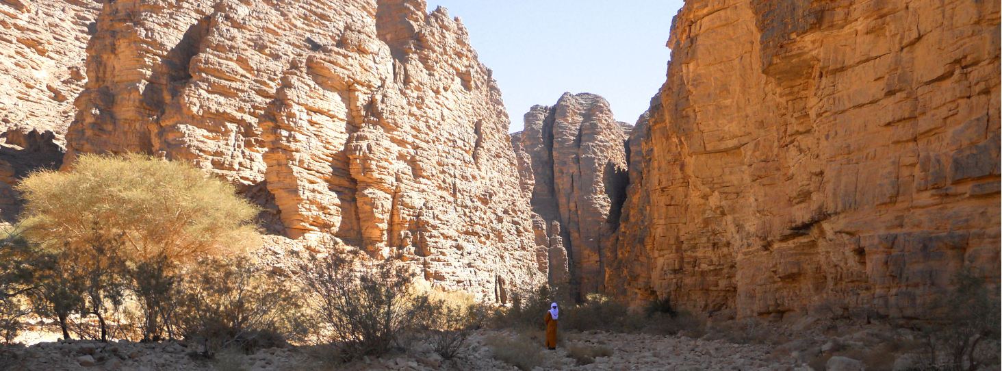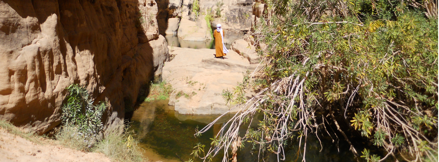 Nach einem kurzen Besuch der Oasenstadt Djanet fahren wir in nordwestlicher Richtung zwischen dem Hochplateau des Tassili N'ajjer und den Sanddünen vom Erg Admer durch ausgetrocknete Flussbetten und umgeben von bizarren Felsformationen. In Tikoubaouène bestaunen wir einen Torbogen aus Sandstein. Im Canyon von Issendilène wandern wir an blühenden Oleanderbüschen, Akazien und Tamarisken entlang. Tief im Canyon verborgen werden wir eine Wasserstelle entdecken.